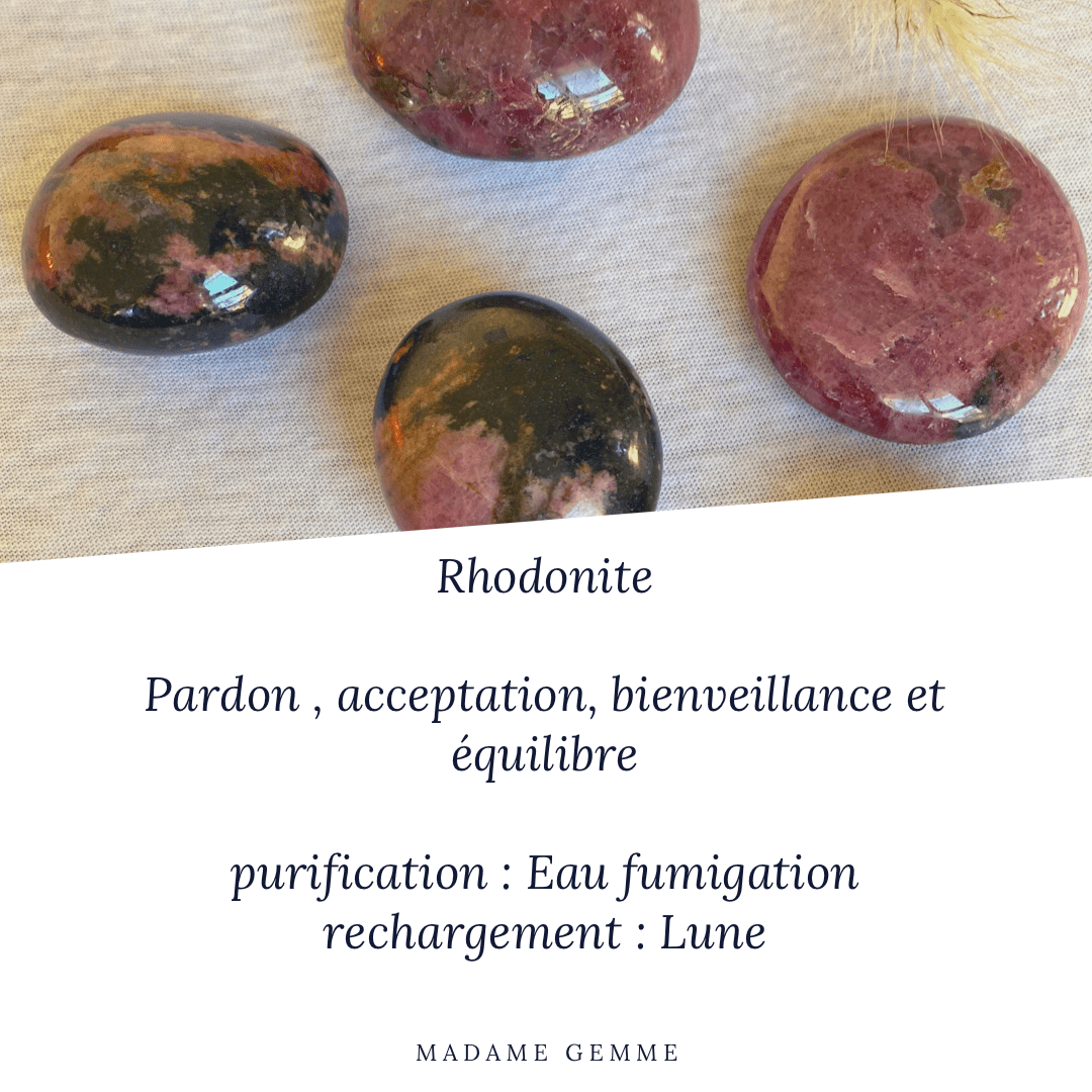 La rhodonite est une pierre de pardon. Elle améliore l’estime de soi. Elle vous invite à la compassion et favorise la réconciliation.